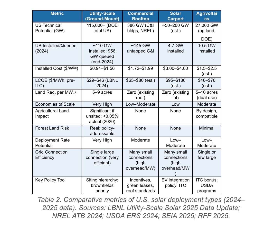This analysis offers a comprehensive, data-grounded assessment organized as follows. Section 2 establishes the scale of the solar deployment challenge through 2035 and 2050. Section 3 analyzes utility-scale ground-mounted solar — its economics, land requirements, and pipeline. Section 4 examines commercial and industrial rooftop solar and solar carports. Section 5 addresses the agricultural land controversy with empirical rigor. Section 6 examines the separate but critical issue of solar development on forested land. Section 7 provides a direct comparative synthesis with supporting data tables. And Section 8 draws policy implications.