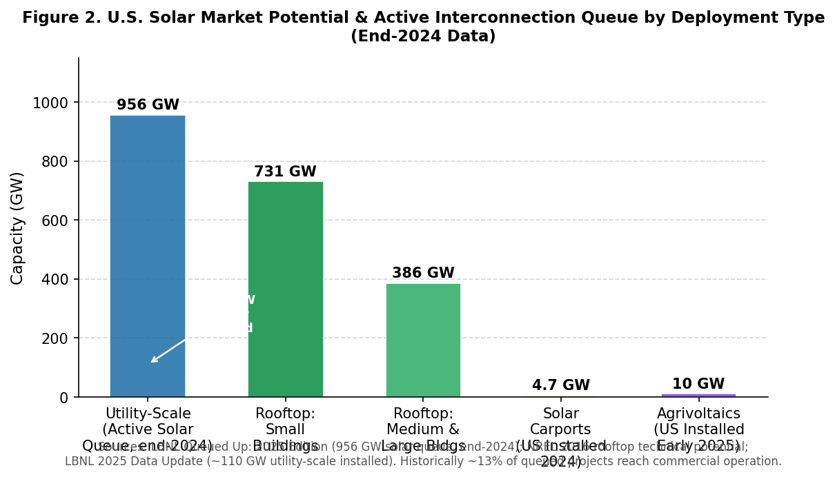 Figure 2. U.S. solar active interconnection queue and installed capacity by deployment type (end-2024). The utility-scale queue of 956 GW dwarfs all built-environment categories combined; ~110 GW is already operating. Note: approximately 13% of queued projects from 2000–2019 reached commercial operation by end-2024 (LBNL Queued Up: 2025 Edition).