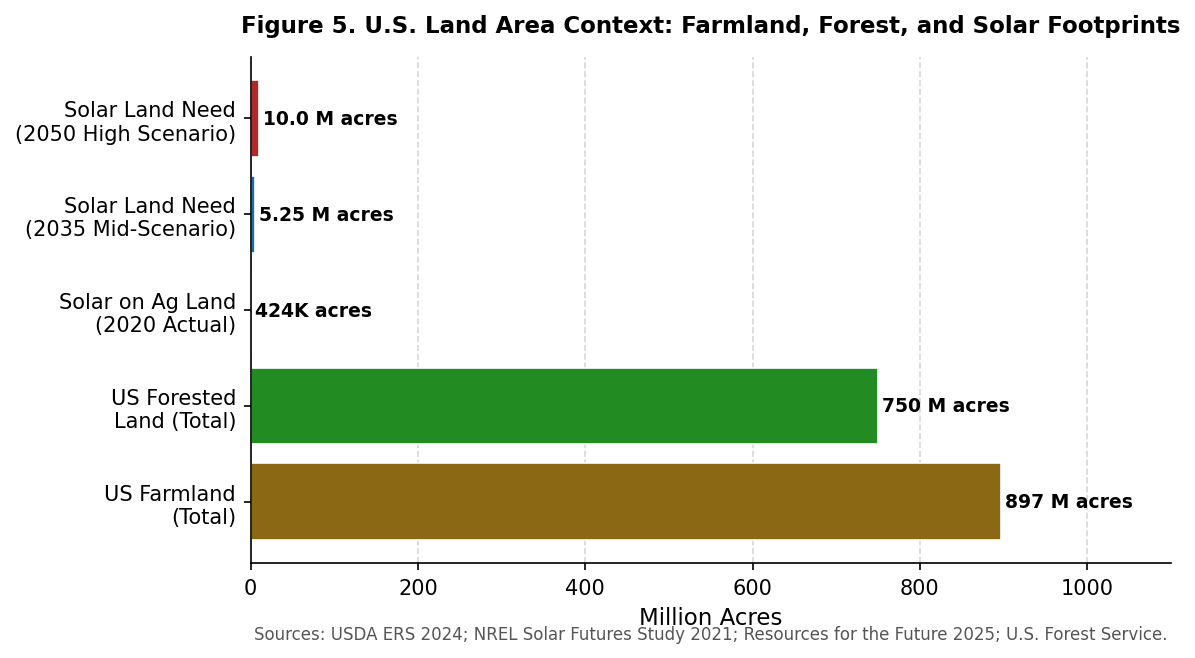 Figure 5. U.S. land area context: total farmland, total forested land, and solar land footprints (actual 2020 and projected 2035/2050). Solar’s actual footprint is minuscule relative to both farmland and forest baselines, but trajectory and siting quality matter enormously.