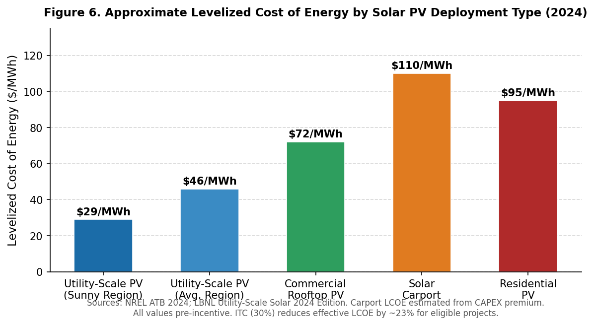 Figure 6. Approximate levelized cost of energy by solar deployment type (2024, pre-incentive). The utility-scale cost advantage is structural and enduring, not merely a function of current technology.