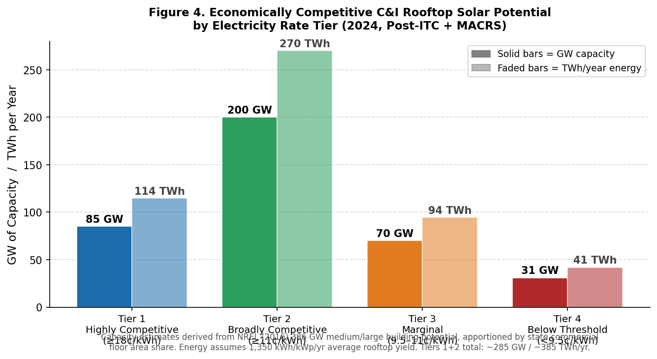 Figure 4. Estimated U.S. medium/large commercial rooftop solar capacity and energy potential by economic tier (2024 EIA commercial rate data; NREL 2016 technical potential apportioned by state commercial floor space share). Tiers 1+2 combined: ~285 GW / ~385 TWh/yr.