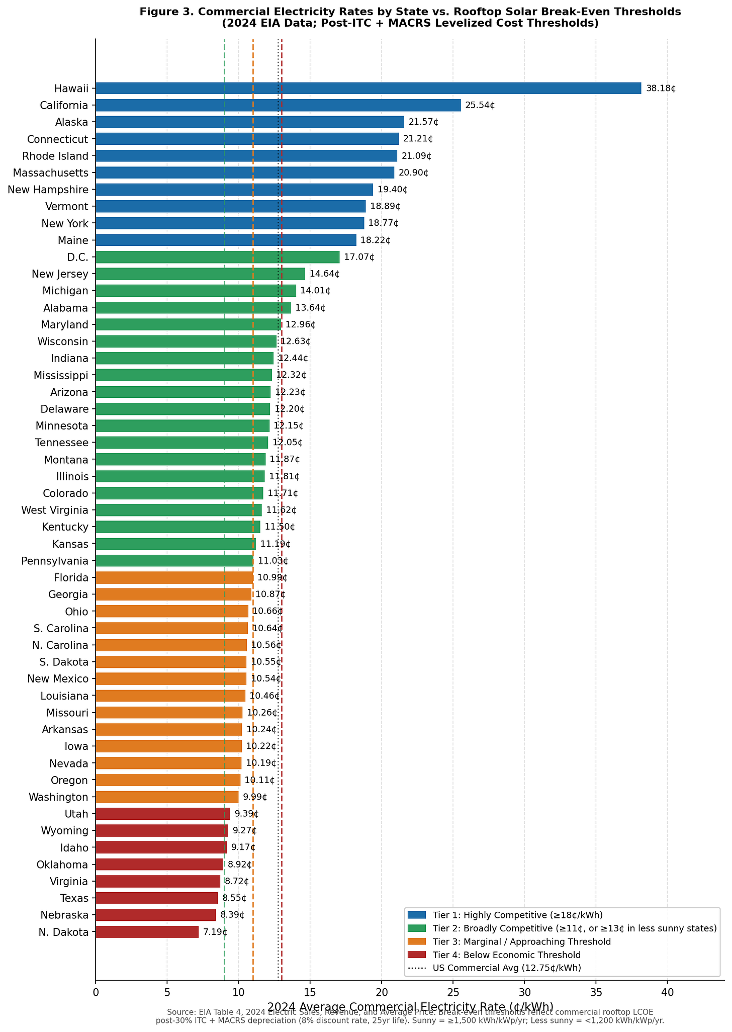 Figure 3. 2024 EIA average commercial electricity rates by state versus post-ITC + MACRS rooftop solar break-even thresholds. States above 18¢/kWh (Tier 1, blue) are highly competitive regardless of incentive access. States 11–18¢/kWh (Tier 2, green) are broadly competitive with standard ITC/MACRS incentives. Source: EIA Table 4, 2024.