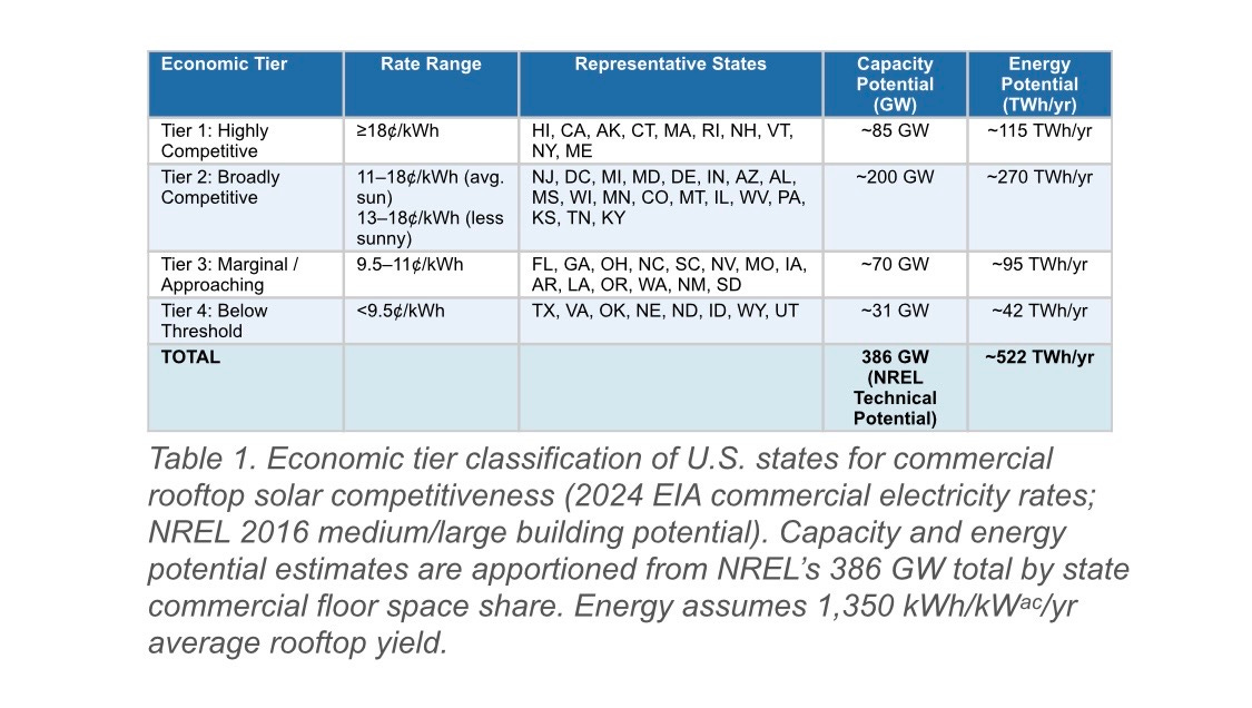 Under this apportionment, Tier 1 states — dominated by California, New York, Massachusetts, and Connecticut — account for approximately 22 percent of U.S. commercial building stock, or roughly 85 GW of the 386 GW technical potential. At an average rooftop yield of approximately 1,350 kWh per kWᴰᶜ per year (blended for the solar resources of these states), this translates to approximately 115 TWh of annual electricity generation. Tier 2 states contribute an additional estimated 200 GW and approximately 270 TWh/year. Together, Tiers 1 and 2 represent approximately 285 GW of rooftop potential — nearly three-quarters of the total NREL estimate — in markets where commercial rooftop solar is broadly competitive with standard ITC and MACRS incentives.