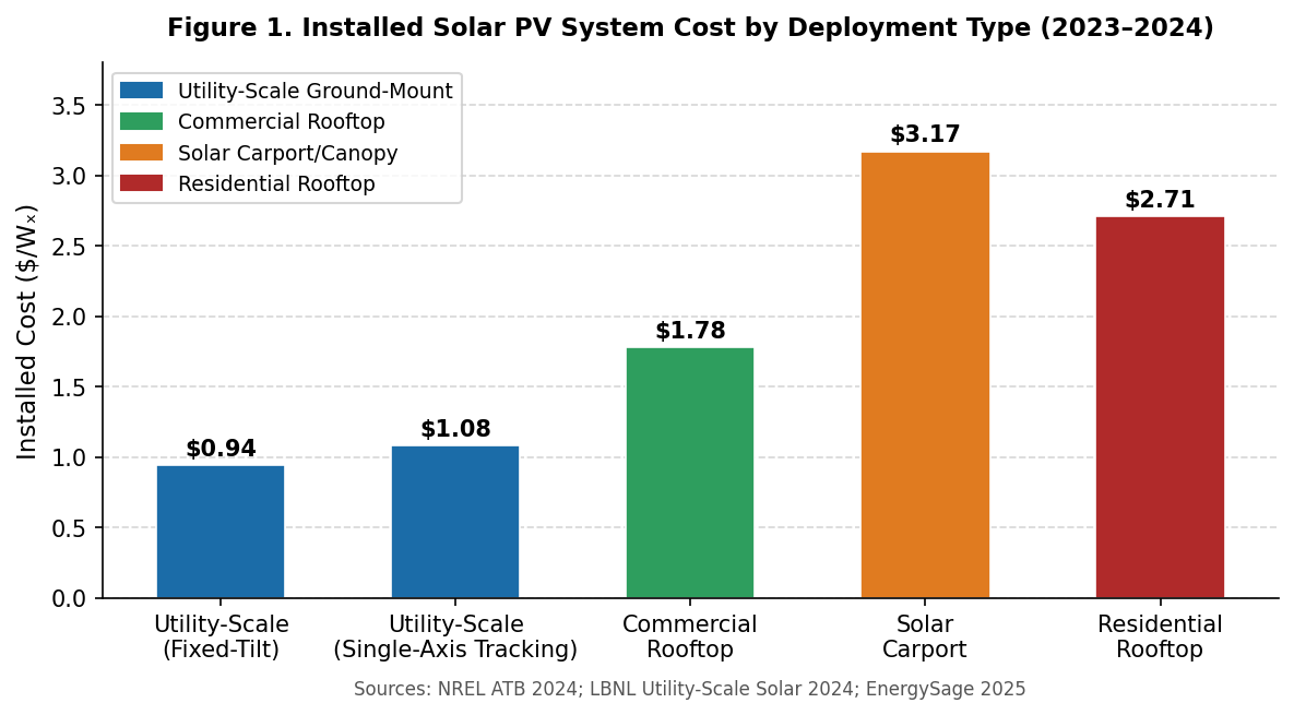 Figure 1. Installed capital cost comparison by solar deployment type (2023–2024). The 65–195% cost premium of built-environment alternatives over utility-scale ground-mount reflects irreducible structural and logistical overhead.